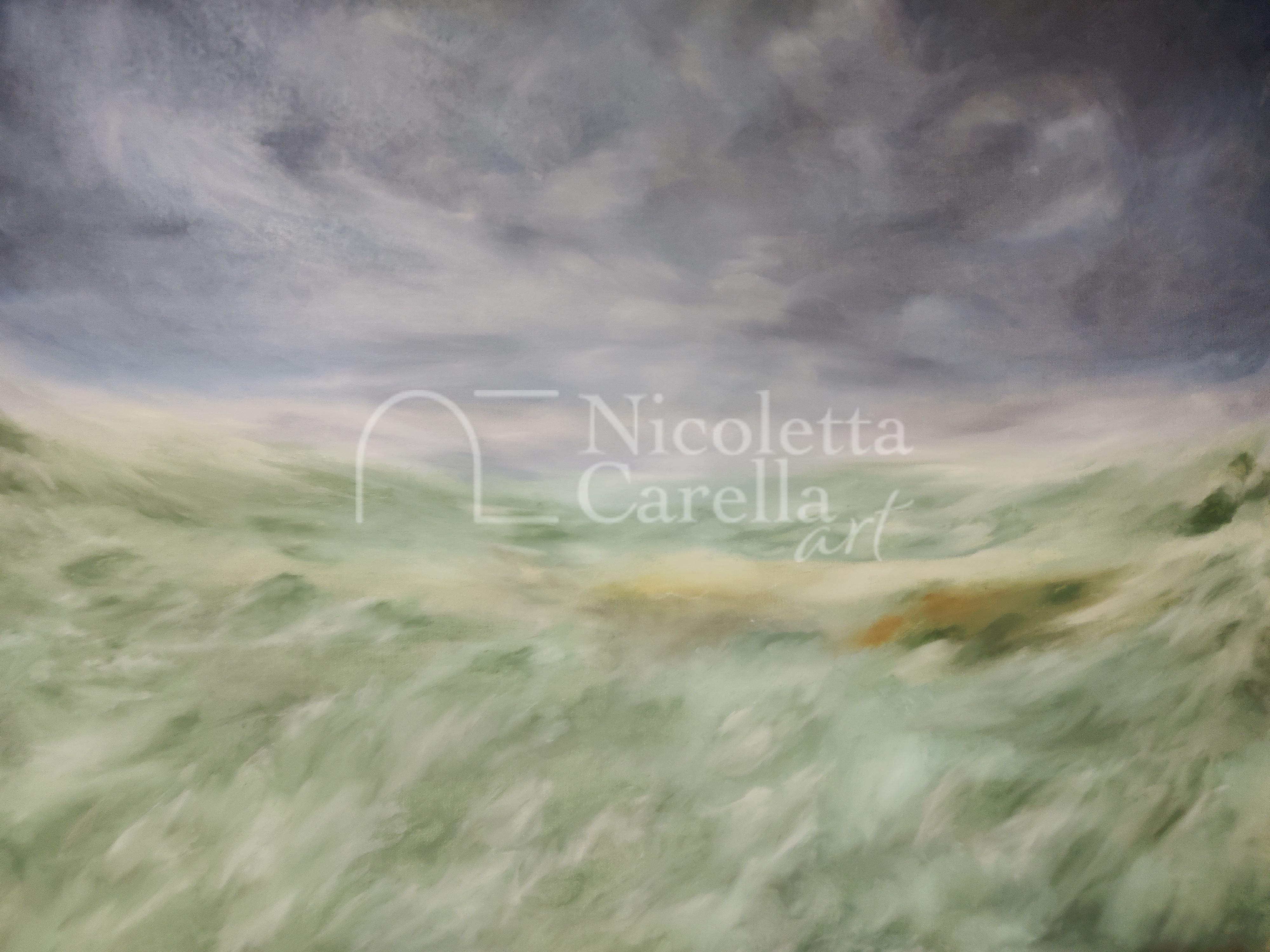 The end of the day marked by this moment of the day has a strong emotional impact on the human soul that is pervaded by the quiet and nostalgia for the day that is over. The transition phase of sunset prepares for the future of the darkest moment and warm colors console people for the last time before night. The nostalgic soul of the artist comes out in all its beauty through the strong image of an exciting sunset [...] The strong similarity between the meadow and the sea is due to the grandeur of the landscape which in the common imagination is connected to the idea of infinity that fascinates the human soul. The abstract current meets the romantic surrealism used by the artist to show a sea exactly as it is in her imagination and thanks to which she expresses an inner torment and with which she emerges from the conventional image of the sea and the sea itself becomes an instrument of liberation for the artist